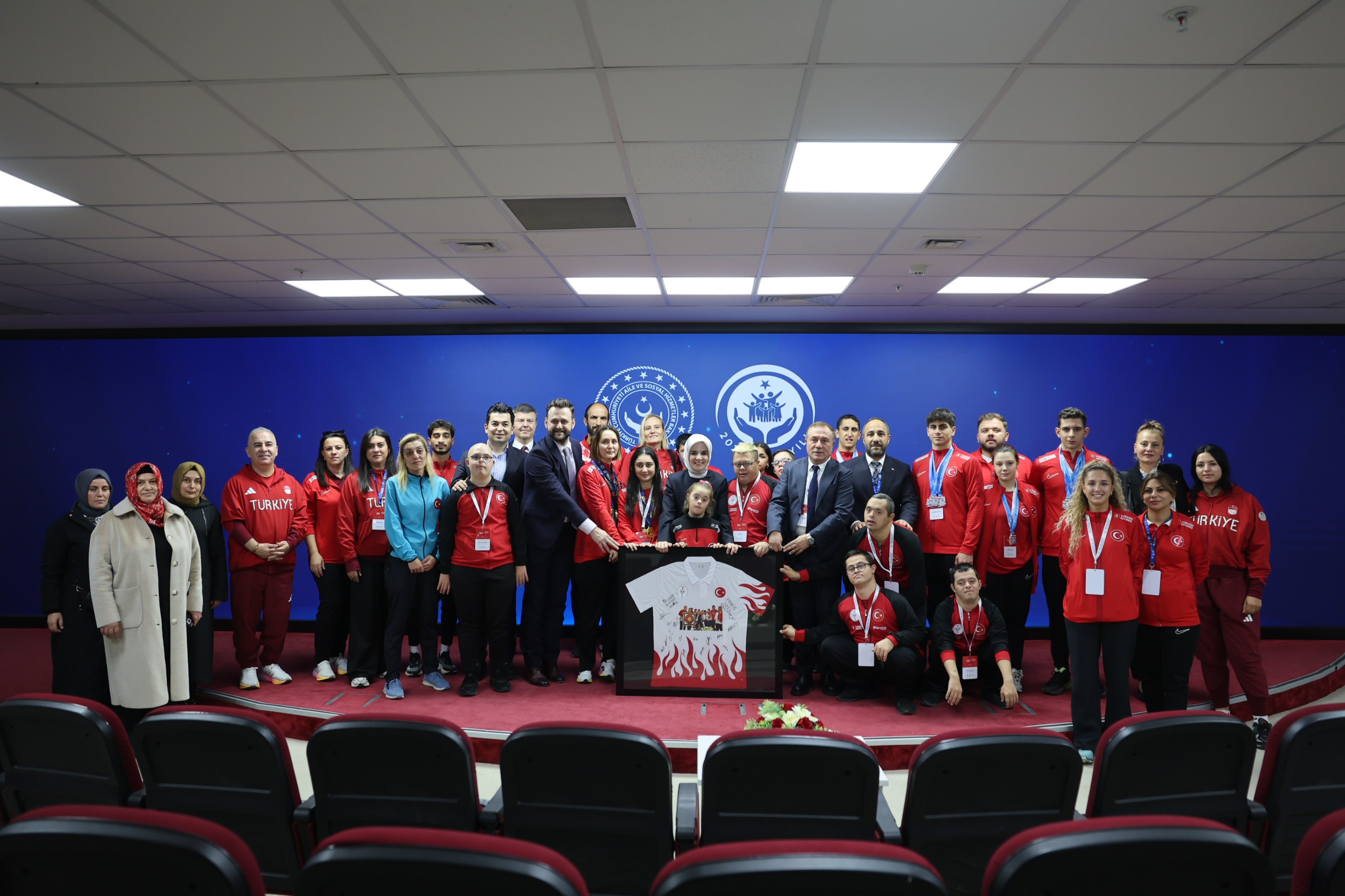 Ziyarette özel sporcularımız, Sayın Bakanımıza günün anısına 2024 Trisome Games ve 2024 Paris Paralimpik Oyunlarında Madalya kazanan Şampiyon Özel Sporcularımızın imzaladığı Milli Takım Forma Tablosu takdim edildi. Samimi bir atmosferde gerçekleşen kabulde, özel sporcularımız ve milli takım kafilemiz Bakanlık makamında sıcak ve anlamlı bir şekilde ağırlandı.