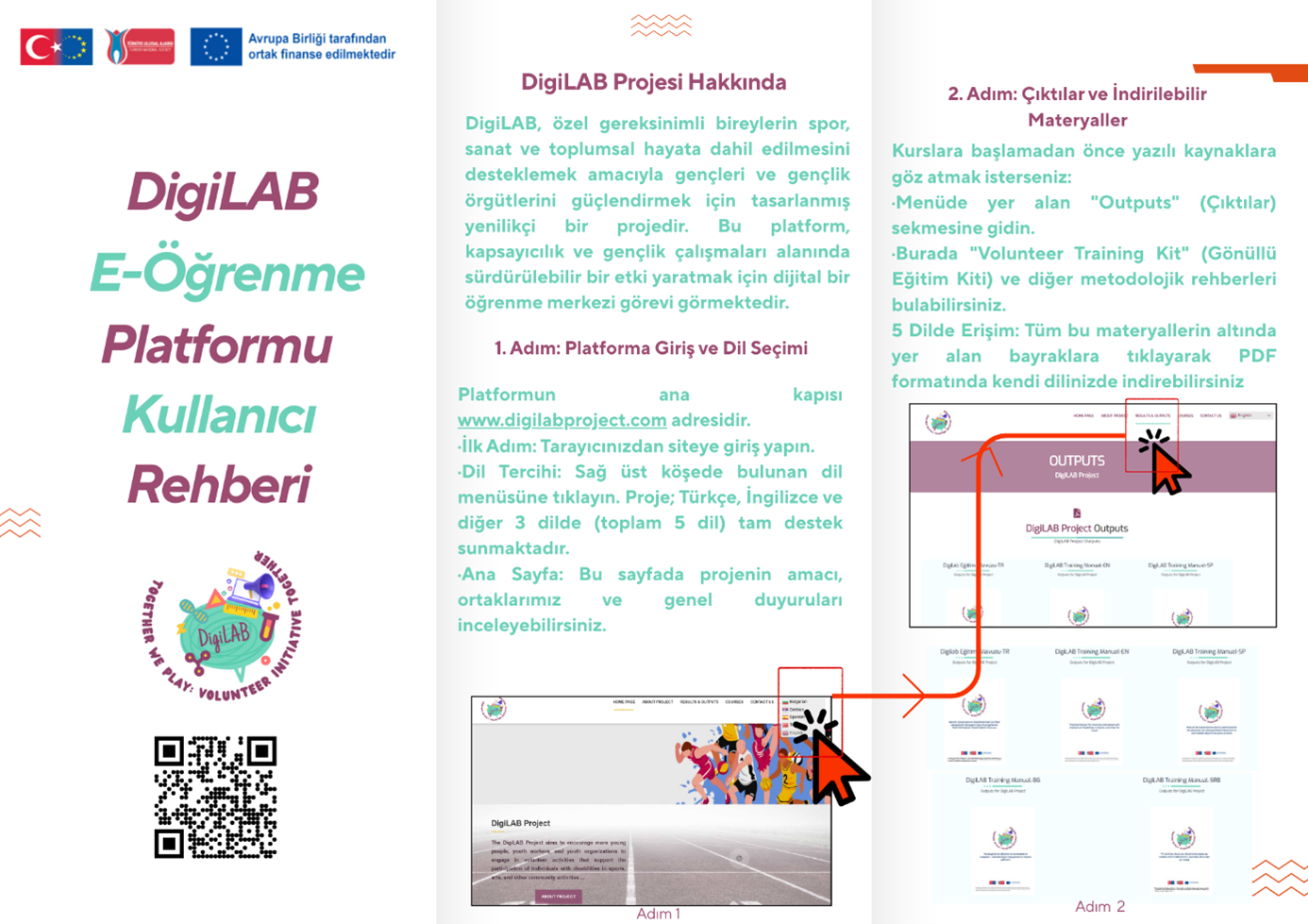 Proje kapsamında, özel gereksinimli bireylerin spor, sanat ve toplumsal yaşama katılımını desteklemek amacıyla gençler, gençlik çalışanları ve gönüllüler için kapsamlı dijital eğitim kaynakları geliştirilmiştir. Bu çalışmalar sonucunda DigiLAB platformunda 10 farklı çevrim içi kurs modülü hazırlanarak eğitime açılmıştır.