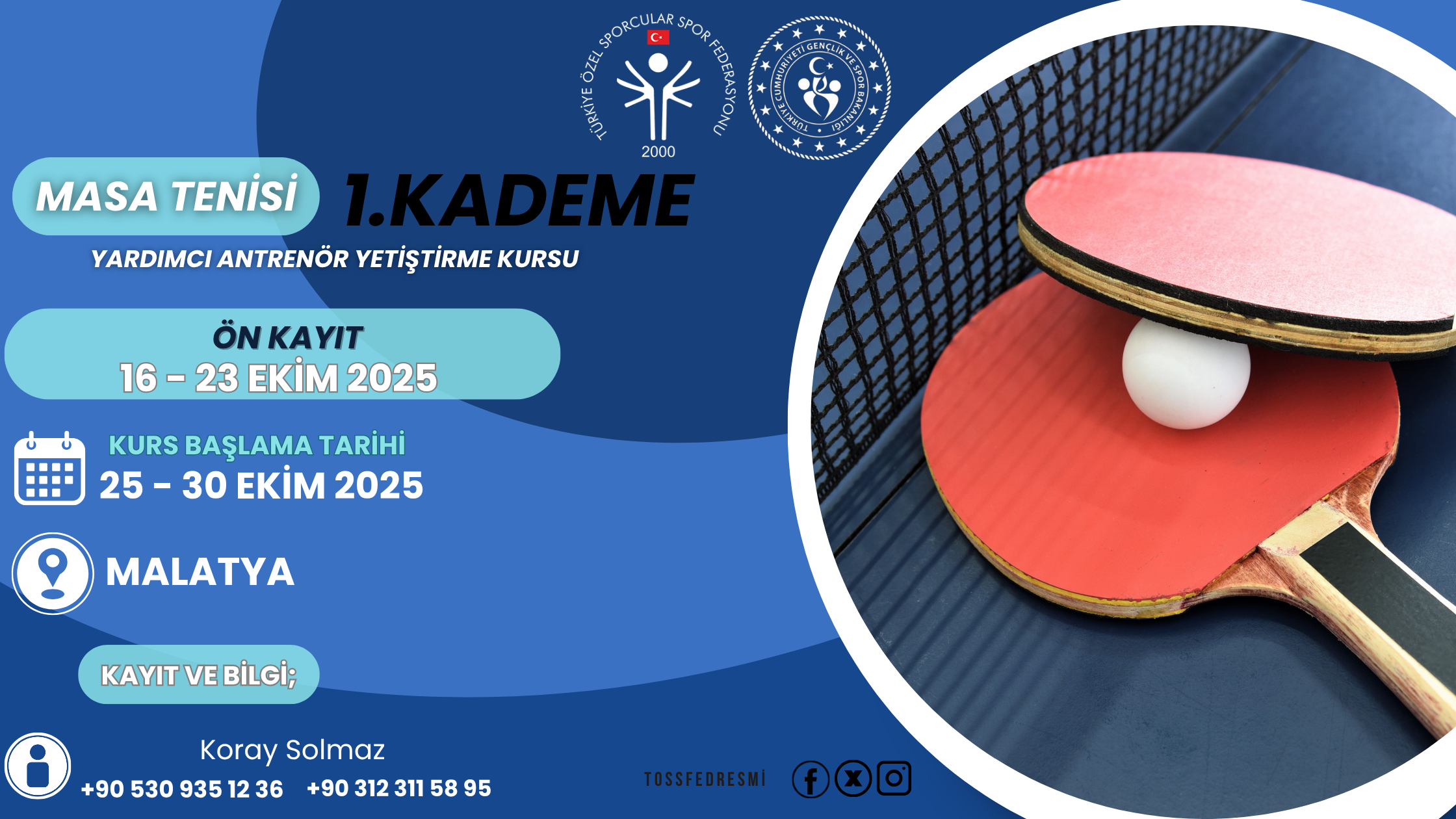 ÖZEL SPORCULAR 1.KADEME MASA TENİSİ YARDIMCI ANTRENÖR KURSU 25 – 30 EKİM 2025 TARİHLERİ ARASINDA MALATYA’DA YAPILACAKTIR.