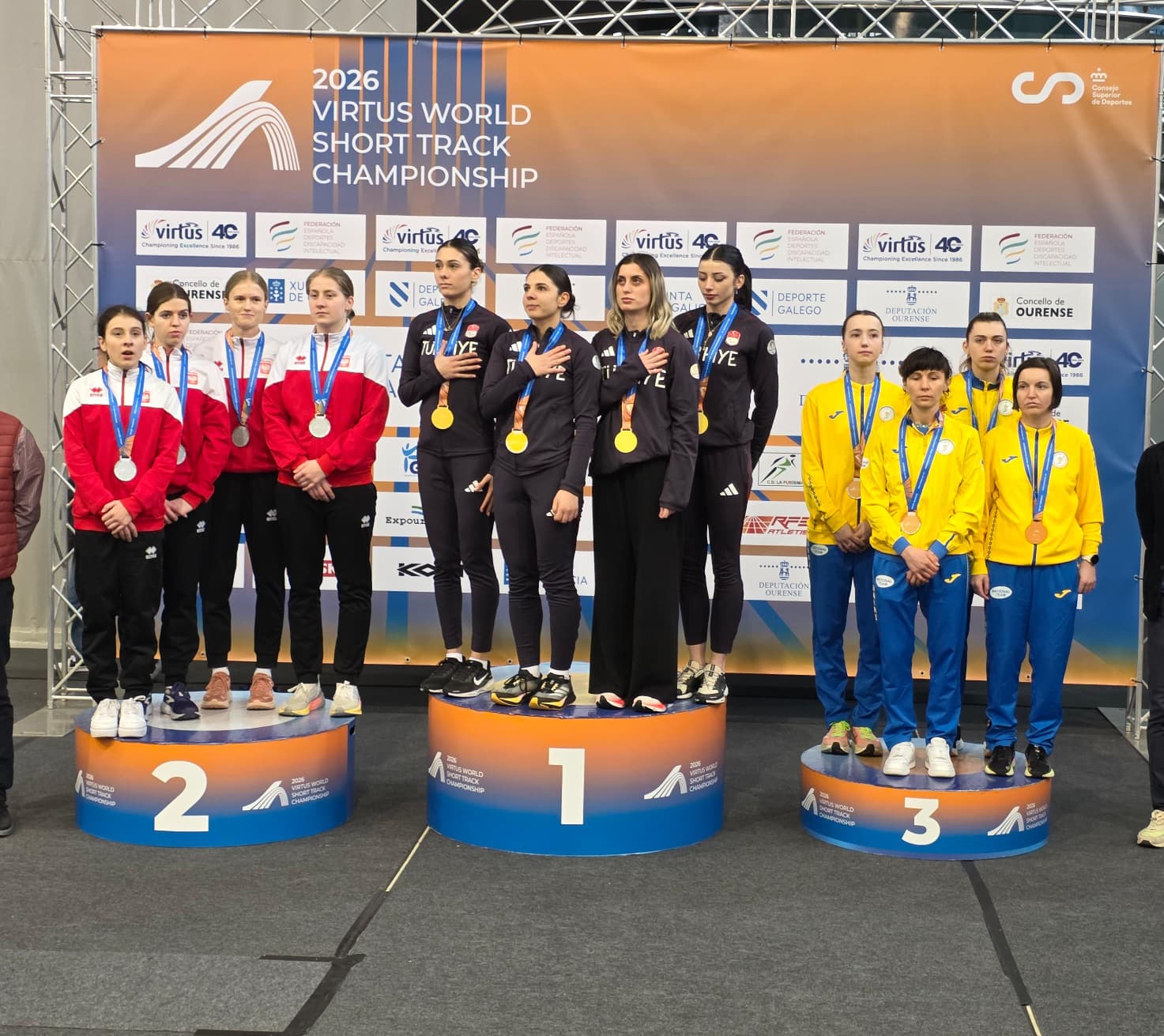 İspanya’nın Ourense kentinde düzenlenen VIRTUS Para Atletizm Dünya Salon Şampiyonası’nda özel sporcularımız Aysel Önder, Fatma Damla Altın, Esra Bayrak ve Reyhan Taşdelen’den oluşan milli takımımız, T20 kategorisi 4×200 metre kızlar bayrak yarışında 1:52.35’lik derecesiyle dünya şampiyonu olarak altın madalyanın sahibi oldu.