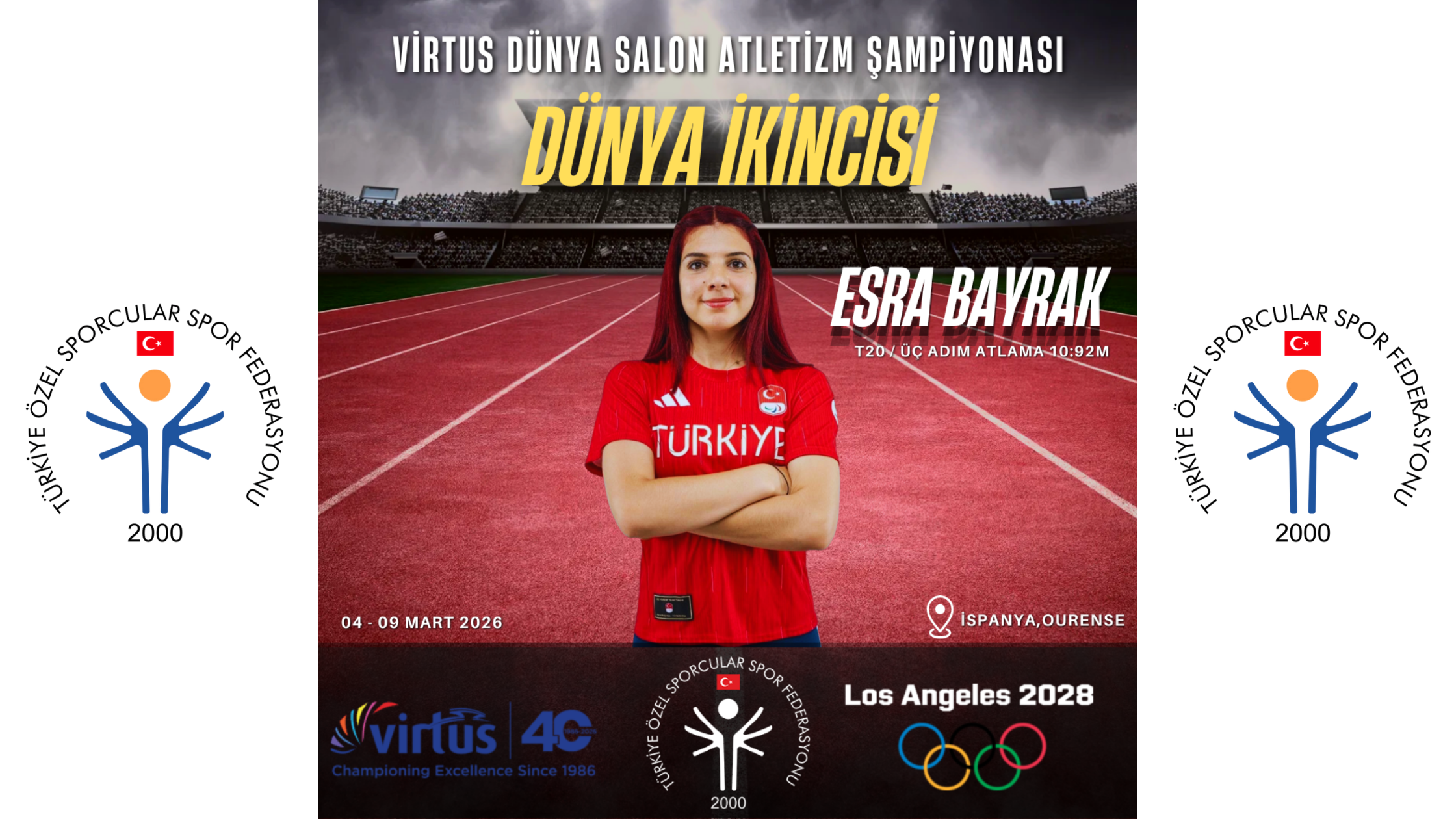 “VIRTUS Para Atletizm Dünya Salon Şampiyonası’nda üç adım atlama branşında dünya ikincisi olarak bizlere büyük bir gurur yaşatan özel sporcumuz Esra Bayrak’ı yürekten tebrik ediyorum.