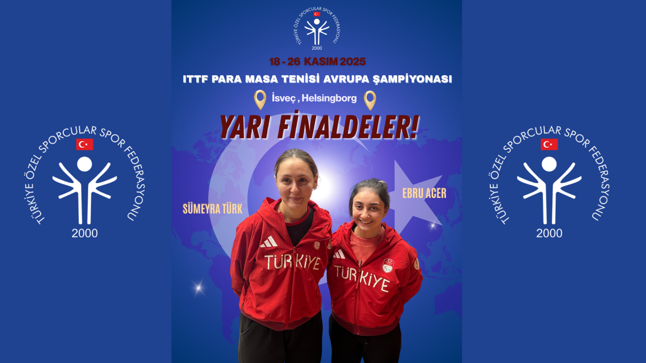 İsveç’in Helsingborg kentinde devam eden ITTF Para Masa Tenisi Avrupa Şampiyonası’nda milli sporcularımız Ebru Acer ve Sümeyra Türk, gösterdikleri üstün performansla yarı finale yükseldi.